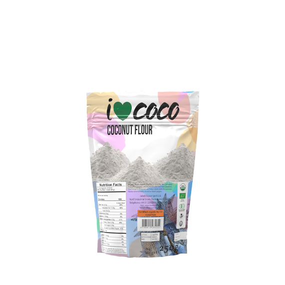 I Love Coco coconut flour is manufactured by separating the rich, white coconut meat from carefully selected organic coconut shells. These are then shredded and pressed to reduce moisture into an extreme level and also fat content and then milled into a fine flour to achieve a texture reminiscent of wheat flour. As a gluten-free, plant based source of protein and fiber, it is an ideal ingredient in baking and is splendid in many smoothies.