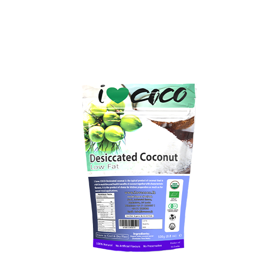 Usages: I Love Coco low fat organic desiccated coconut are produced from Sri Lankan organic coconut flesh which is rich in fresh and tropical coconut flavor. It is best as fillings and toppings in many dietary food recipes.